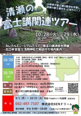 清瀬で今でも活動している富士講の歴史を学ぶ1泊2日のツアーを募集中です!!このツアーだけの特別講演も開催します。 秋の山梨へ歴史を学びに行きませんか? 開催趣旨 清瀬市には現役で活動している富士講(武州丸嘉講田無組中里 […]